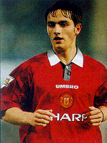 debut against Middlesbrough in the 96/97 season. This tough-tackler has made the most of the chances that have come his way and looks like a United star of the future. In the FA Cup tie against Wimbledon during the same season, Clegg up-ended a certain Vinnie Jones - so there's no doubting his commitment or courage. Clegg's mature performances were a pleasant suprise for Alex Ferguson, and he was voted the club's Young Player of the Year. He also was voted the Pontins League Player of the Year, and people were comparing his talents to those of Stuart Pearce - not bad for a lad of 20. |